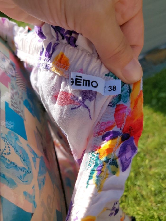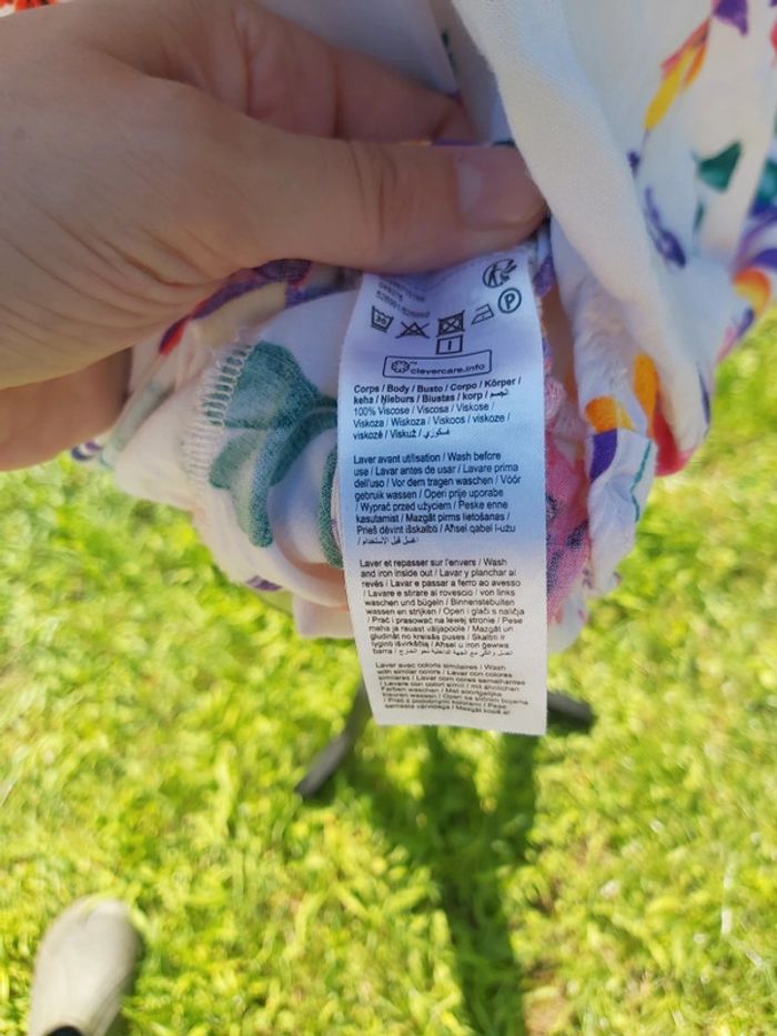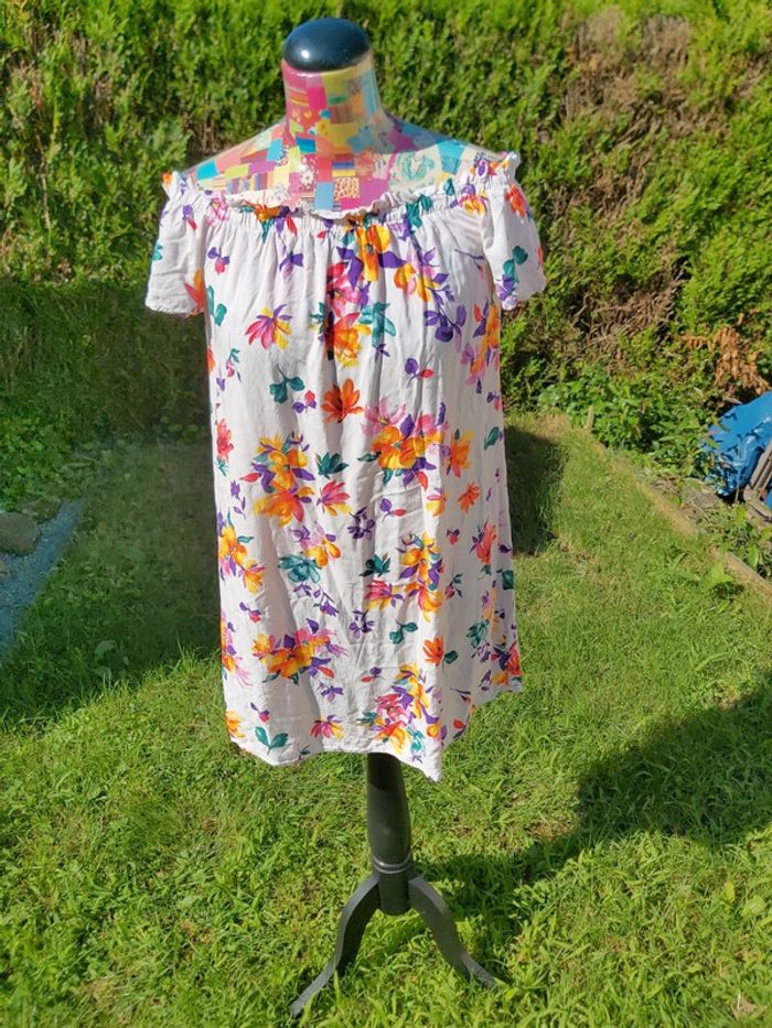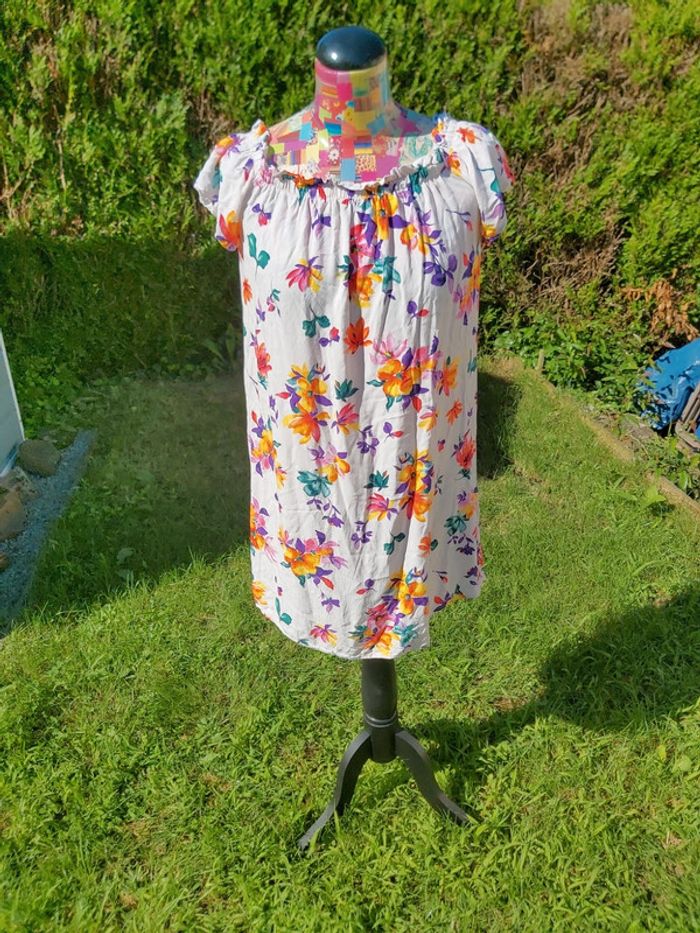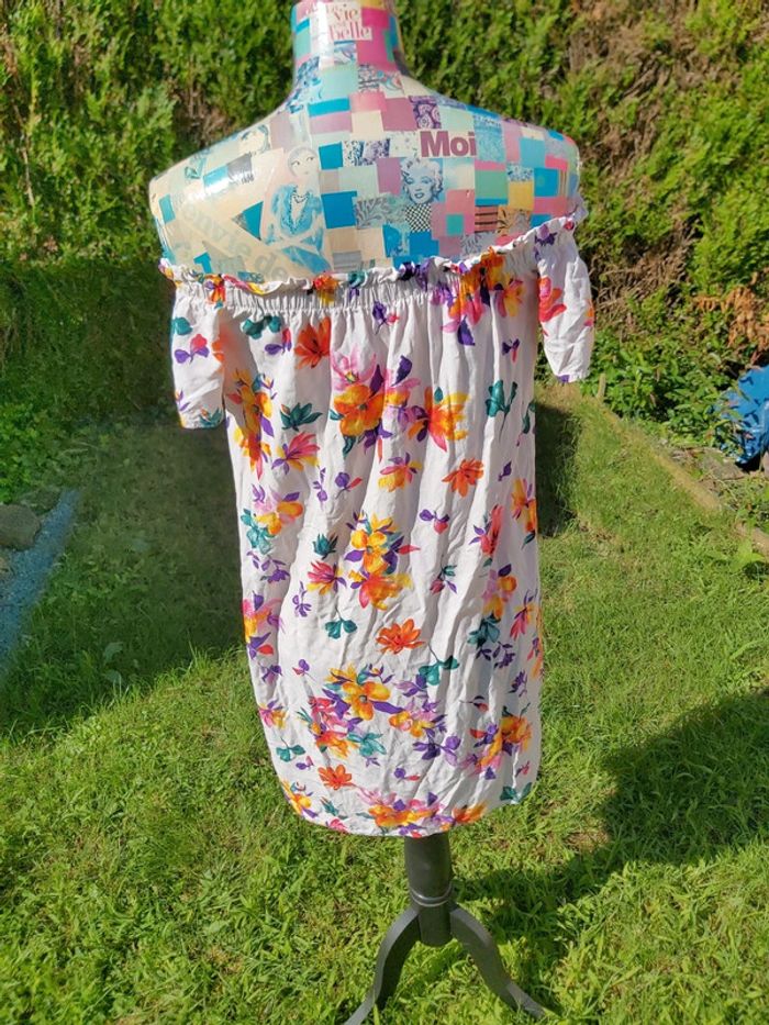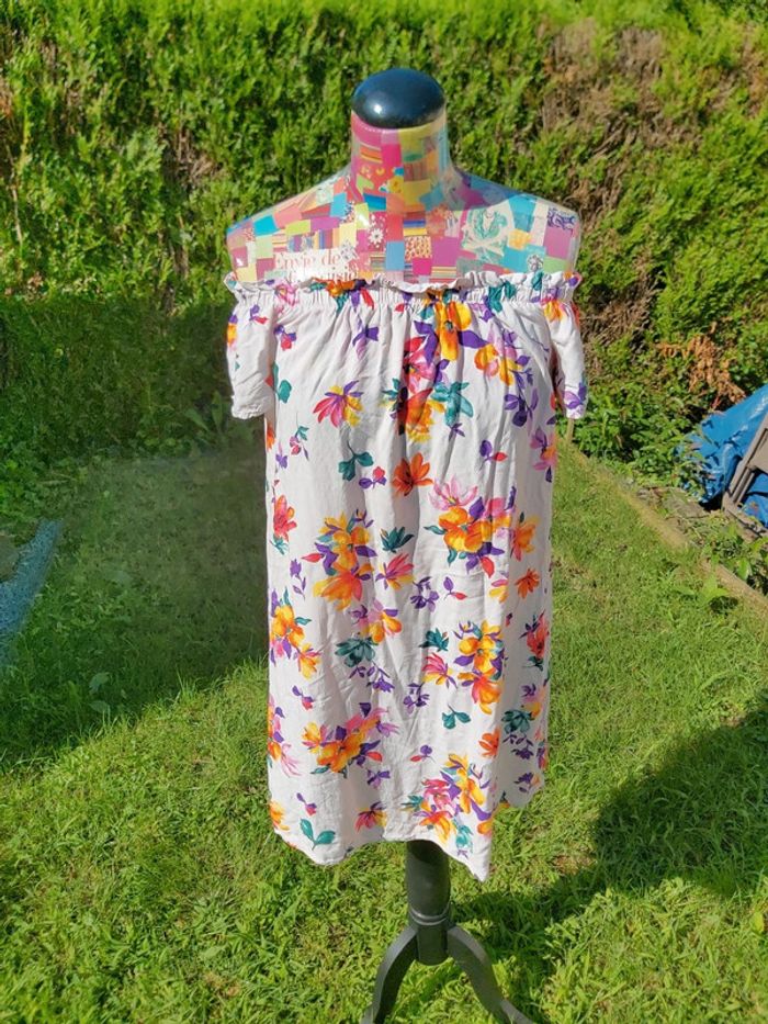 Robe d'été, courte et fluide. Motif floral. Très peu portée. Les manches se portent sur les épaules oy de façon à avoir les épaules dénudées. Agréable à porter. #clairou44_femme38