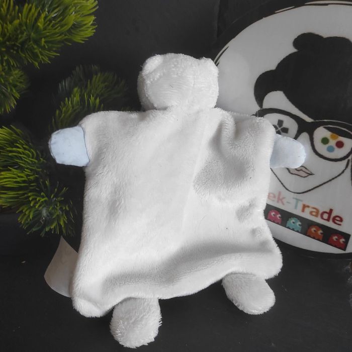 Doudou plat ours tout petit jacadi  blanc Bleu noeud Carré #geektradedoudou - photo numéro 2
