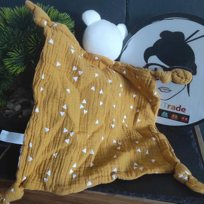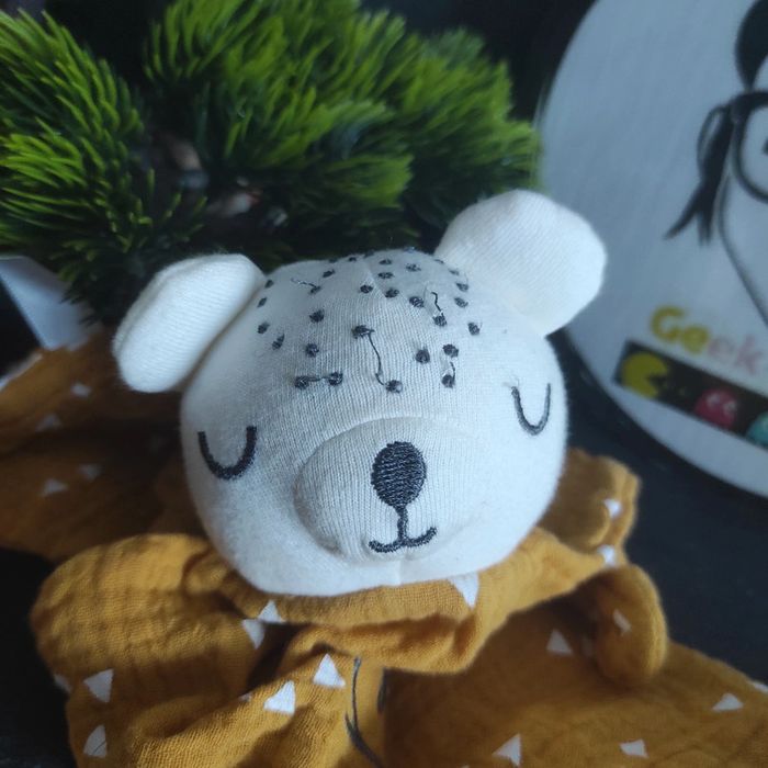 doudou ours lange jaune moutarde blanc bonheur triangle gris coton le redoute Bon etat Les fils sur la tête sont pour certains tirés Afin de ne pas abîmer les doudous et de laisser le choix dans l'utilisation de la lessive les peluches ne sont pas lavées avant envoi Description complément : #geektradelaredoute Petit nettoyage à prévoir Vous achetez ce que vous voyez les photos font entièrement partie de la description Transport : Les frais de transport comprennent les frais du transporteur ainsi que l'emballage pour protéger au mieux votre achat. Chaque achat est envoyé en format colis avec numéro de suivi Le poids du colis est de 500g finit (je ne peux pas faire moins) il peut donc y avoir plusieurs objets dans le carton si vous le souhaitez (contactez moi afinde grouper les frais de port) Référencement : #geektradedoudou #peluche #plush  #doudou #enfant #bebe