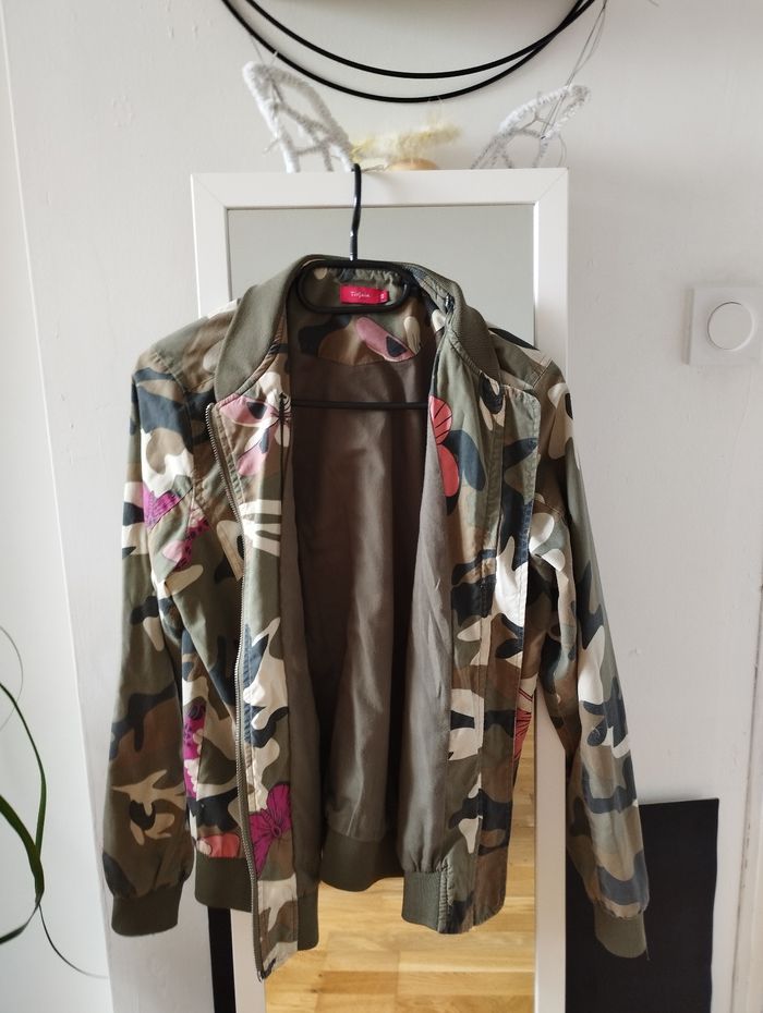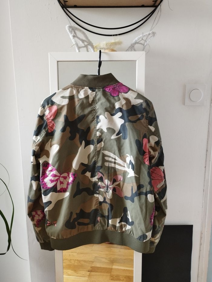 Sur l'étiquette, TAILLE 38 mais taille PLUS PETIT ! Le bombers est en bon état. Je fais 1m61 et je suis fine est les manches sont à 10 cm en moins de mes poignets quand je les lève. Le vêtement serait plus adapté pour une personne portant du XXS voir XS mais pas plus ! (Si vous ne grandissez plus). Des petites "boulottes" sont visibles à l'intérieur du vêtement dû à l'usure. Je ne connais pas la composition du bombers car l'étiquette a été enlevée. Il y a aussi un petit trou à l'intérieur qui n'atteint pas l'extérieur du vêtement (il peut être réparé facilement sans machine à coudre). Avant l'envoi, le vêtement aura été lavé et repassé.