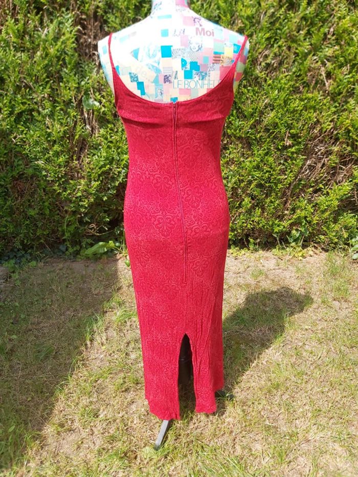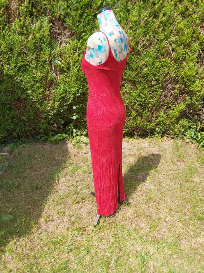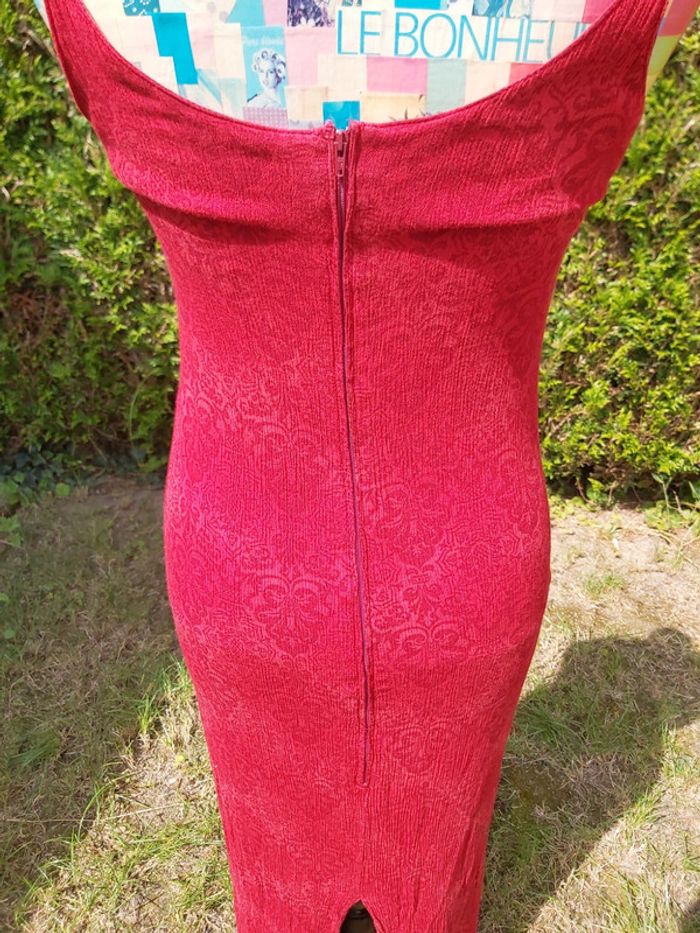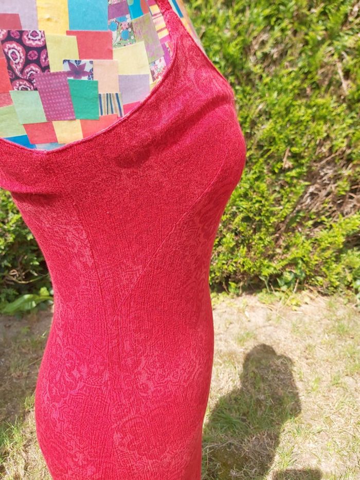 Robe longue à bretelles. Rouge, motifs tons sur tons. Fente et fermeture dorsale. #clairou44_femme38