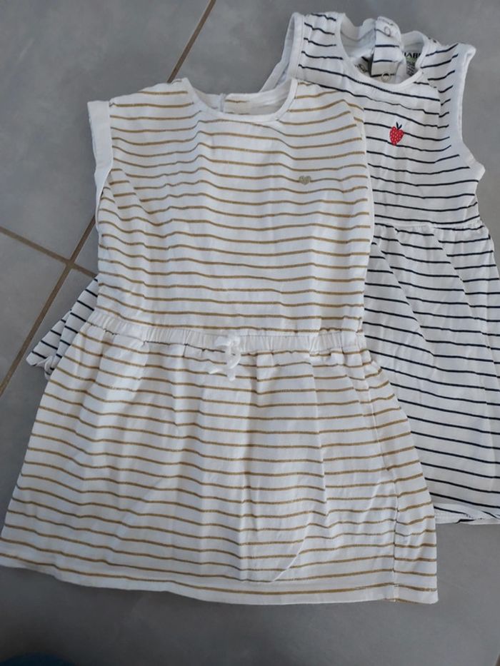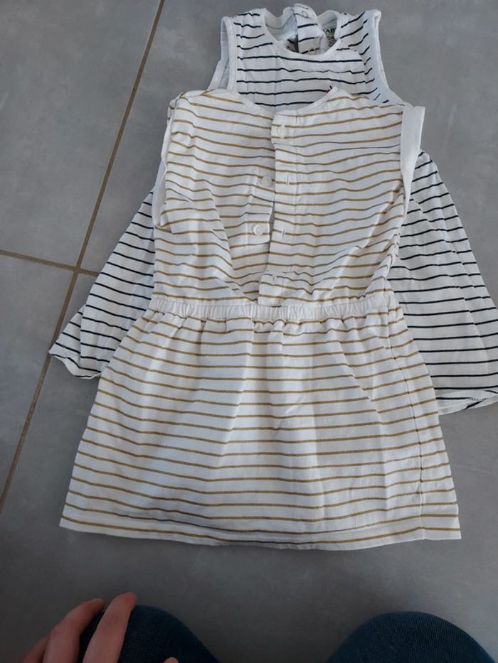 Lot 2 robes 1 rayé doré, et 1 rayé bleu marine Marque Kiabi Raille 24 mois (83-89 cm) Très bon état Peut-être vendu à l'unité sur demande