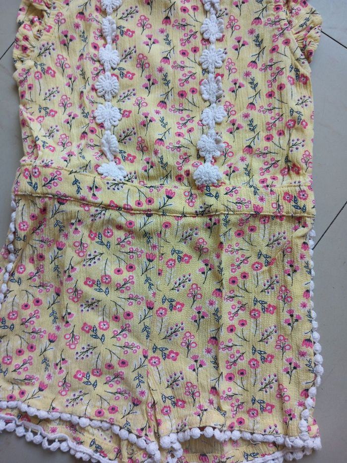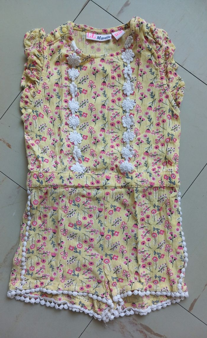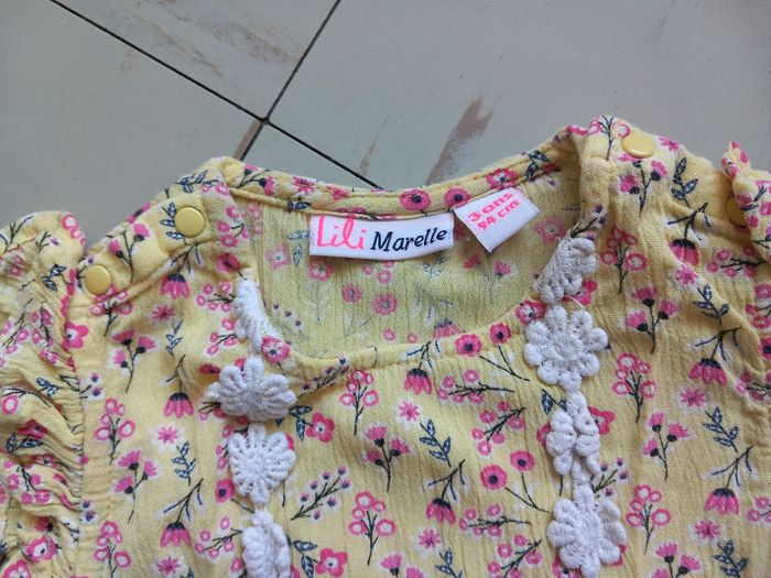 ☆ Ouverture pression au niveau des épaules ☆ Couleur : Jaune ☆ Marque : Lili Marelle ☆ Motif fleurs blanche en dentelle 🌸 ☆ Très bon état