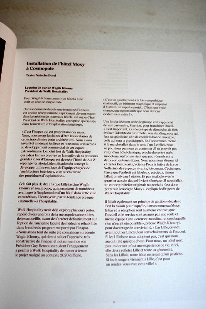Cosmopole Histoire d'un chantier, valeur d'achat 45e, 1.7kg Le projet Cosmopole est l'image même de ce que l'architecture a de plus beau. Il réunit à la fois l'histoire et l'avenir, l'authenticité et la prestation de confort, la solidité structurale et durable, l'utilité avec ses appartements aux dimensions confortables et aux belles prestations, son hôtel de luxe et sa galerie d'art et enfin la beauté par la mise en valeur du patrimoine à travers la conservation et la restauration des façades existantes. C'est pourquoi nous avons voulu réaliser et partager ce recueil de photographies produites par Maxime Dufour qui met en lumière l'histoire d'un chantier, le chantier d'un ouvrage à la fois réhabilité et augmenté sous l'égide des cabinets d'architectures Sintive et RedCat basés à Lille.