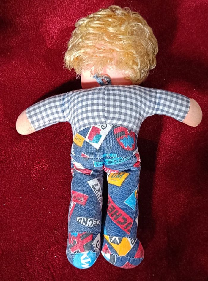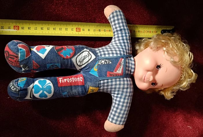 ANCIENNE POUPÉE TISSU btm B.T.M. poupee tissus chiffon SALOPETTE BLEU PUBLICITAIRE CEJI ? CLODREY ? Sur sa salopette plein de marques publicitaire elf, champion, gm, Pirelli, Porsche, Fina, technd, carelli, Triumph, Michelin, .. Beaucoup marques de voiture, poupée pilote mécanicien ? Maison non fumeur et sans animaux collector, collection vintage jeu jouet n'hésitez pas a faire des lots