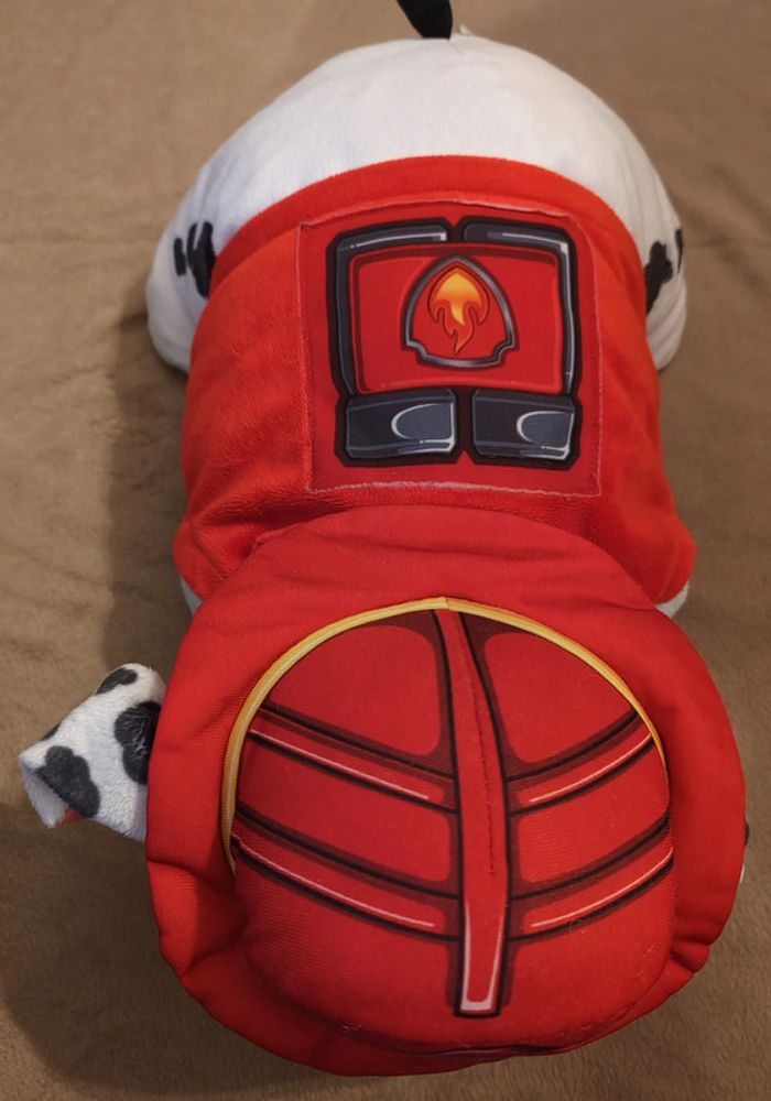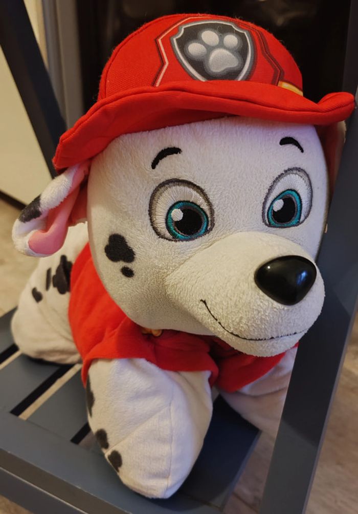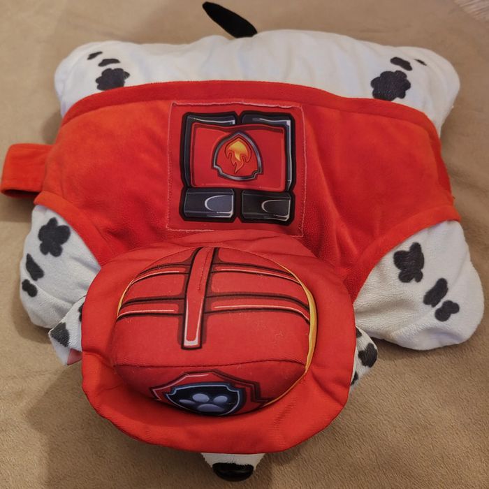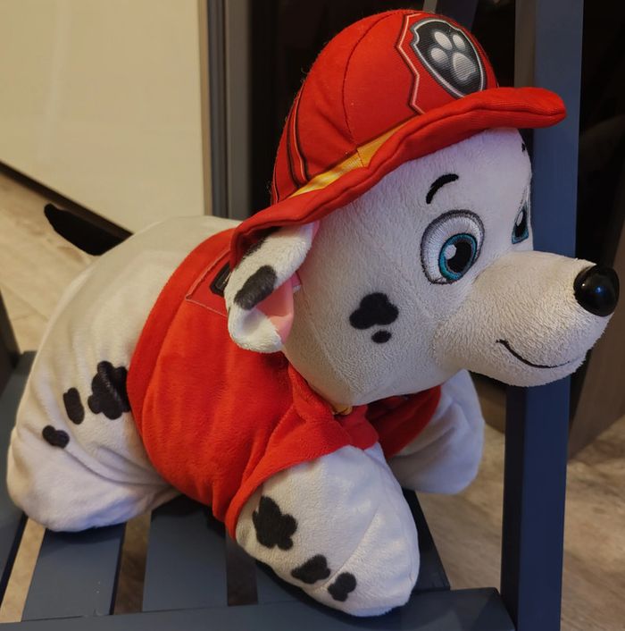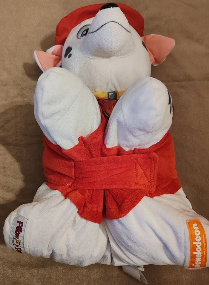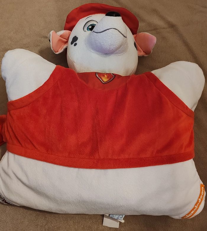 Peluche oreiller Marcus de Pat Patrouille. Se transforme à l'aide d'un scratch. Dimension 42 cm sur 37 cm (en forme oreiller). Nettoyée en machine à laver avant la mise en vente. En très bon état (à part l'étiquette que je n'avais pas coupée qui est déformée). Réduction automatique de 10 à 20% sur les lots à partir de 2 articles achetés et frais d'envoi le moins cher possible.