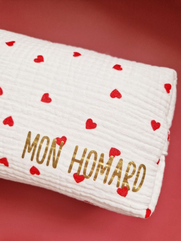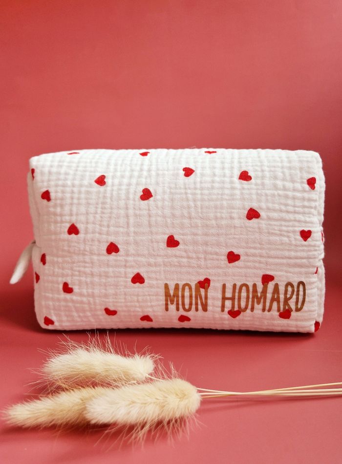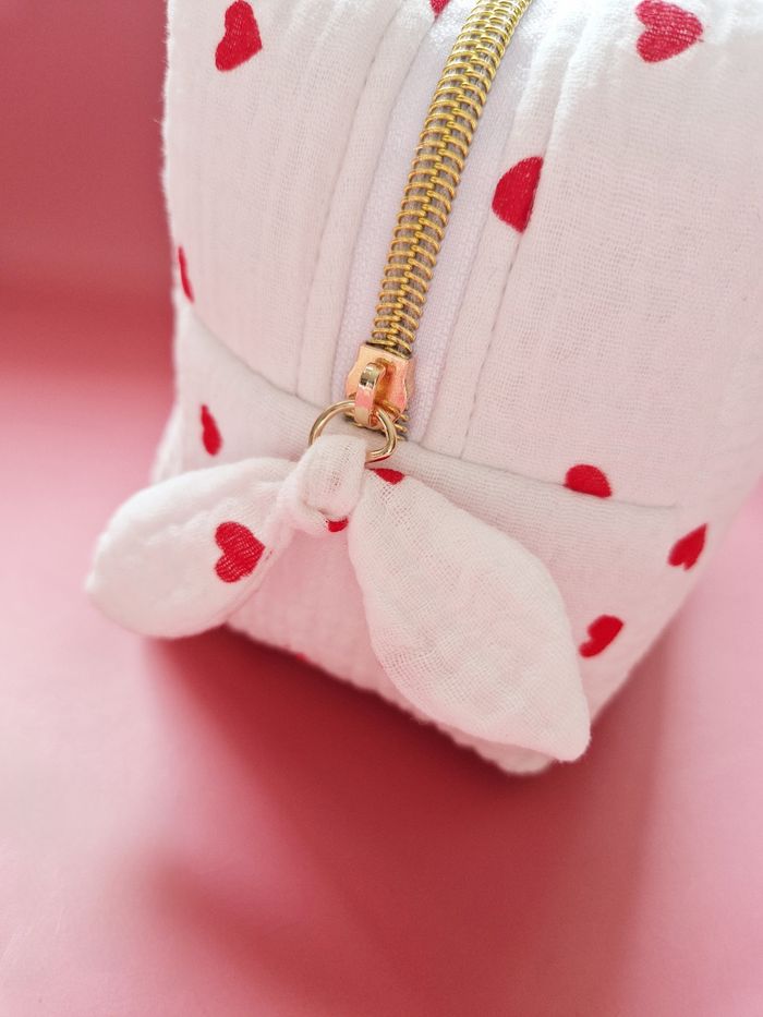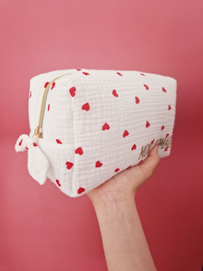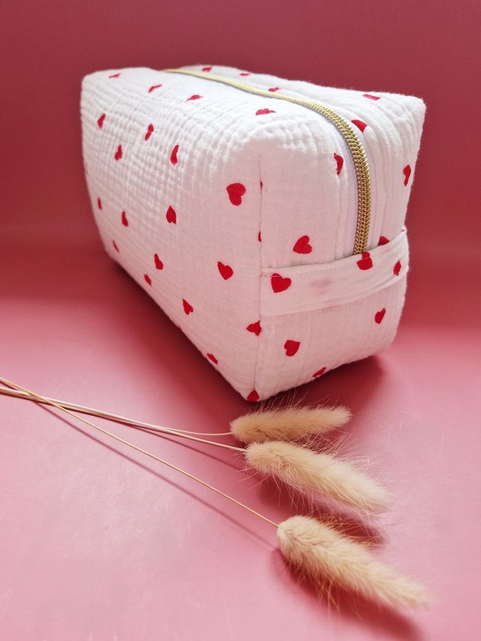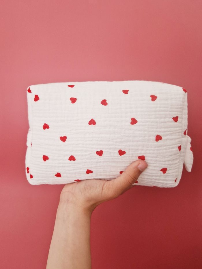 Au sein de mon atelier niché entre les charmantes localités de Sète et Montpellier, je confectionne avec minutie et douceur, cette trousse élégante et pratique. Réalisée en double gaze blanche parsemée de cœurs rouges, cette trousse de 20x15x10 cm allie fonctionnalité et esthétique. Son molleton épais offre une protection optimale pour les affaires de toilette de bébé et celles de maman, même les plus fragiles. Munie d'une anse pratique pour un transport aisé et ornée d'un joli nœud facilitant l'ouverture de la fermeture éclair, cette trousse se distingue par ses détails élégants et pratiques. Pour une touche de sophistication personnelle, elle peut être personnalisée avec le prénom de bébé grâce à un flocage doré, ajoutant ainsi une note unique et précieuse. Les tissus utilisés, certifiés Oeko-Tex ou Bio GOTS, sont exempts de produits toxiques, assurant ainsi la préservation de la peau délicate de bébé et de notre précieuse planète.  Un accessoire alliant élégance et confort, parfait pour les sorties de maman et bébé. Chaque pièce, confectionnée à la commande requiert un délai de création de 3 semaines. Si toutefois, vos besoins sont plus urgents, n'hésitez pas à m'en faire part pour que je vois si je peux ajuster mon emploi du temps pour répondre à votre demande.
