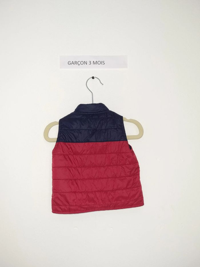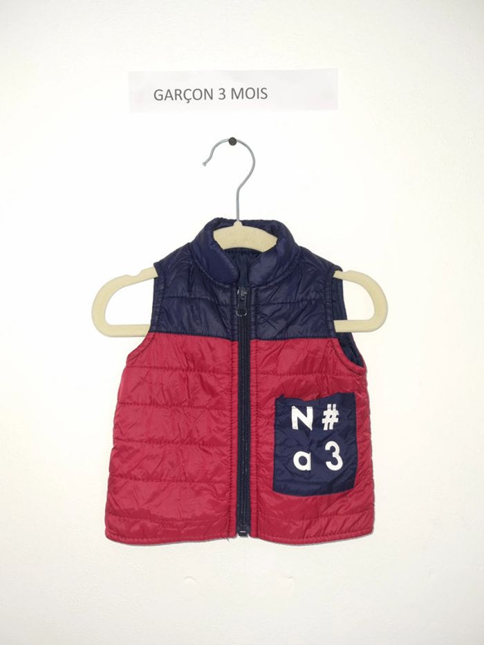 Doudoune à manche courte Bi-color bleu marine et rouge inscription " N#a3" Doudoune assez légère fermeture éclaire 3 mois plutôt garçon