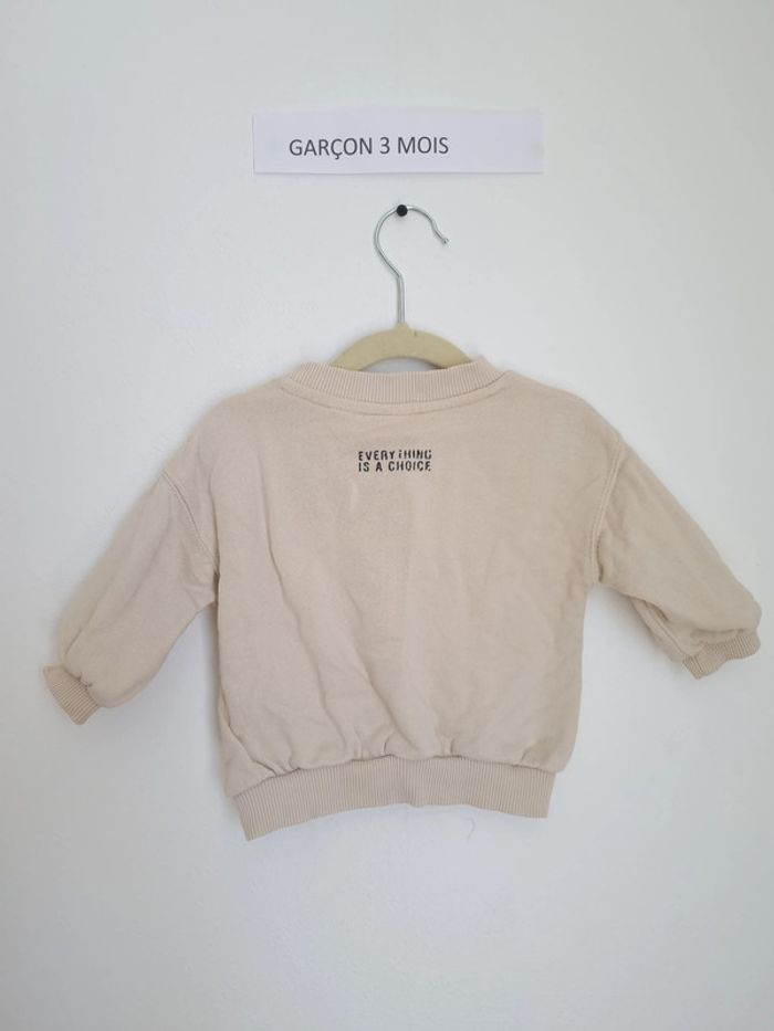 Pull léger manches longues à enfiler uni beige avec inscription AU DOS "everything is a choice" ( = tout est un choix) marque Zara 3-6 mois 68cm ( taille plutôt en 6 mois) Porté quelques fois mais en très bon état tous les vêtements sont lavé et repassé avant envoi mixte