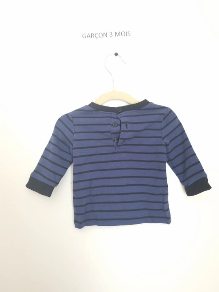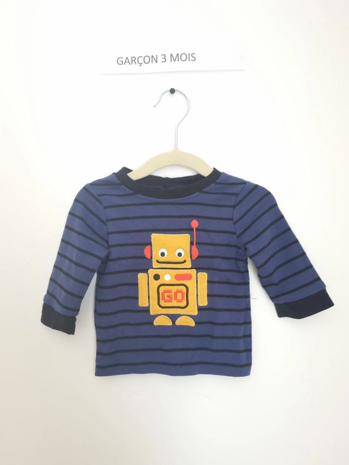 Pull léger manches longues Fermeture à l'arrière jusqu'à mi-dos par boutons Bleu rayé noir avec un grand robot jaune 3 mois Porté quelques fois mais en très bon état