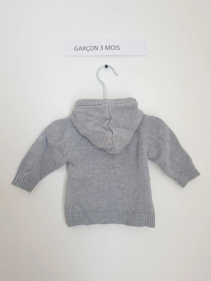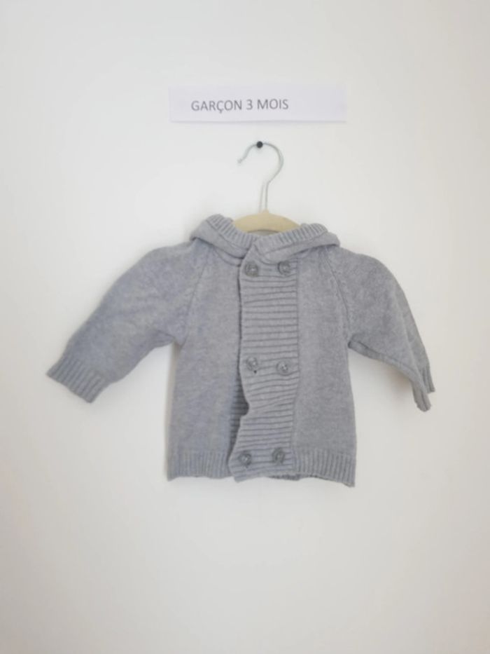 Gilet mixte manches longues Fermeture à l'avant par 2 rangées de boutons gris en maille avec une capuche Marque tape à l'œil 3 mois Porté quelques fois mais en très bon état