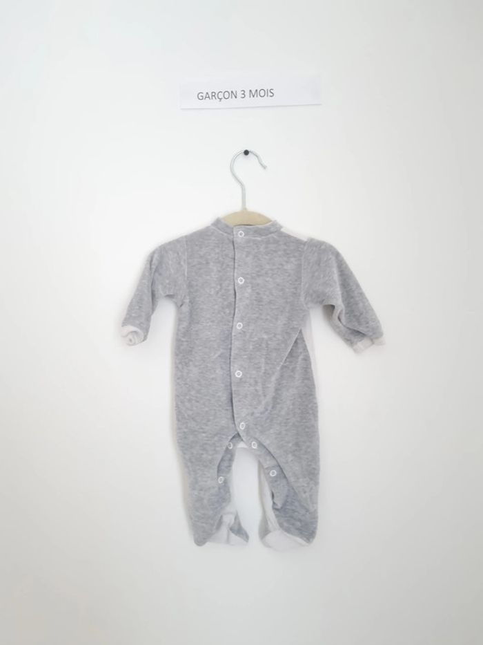 Pyjama 1 pièce chaud utilisé plusieurs fois mais en très bon état marque bébé frial 3 mois fermeture par boutons pression sur l'arrière blanc devant avec motif basket hautes, les manche et l'arrière sont uni gris mixte