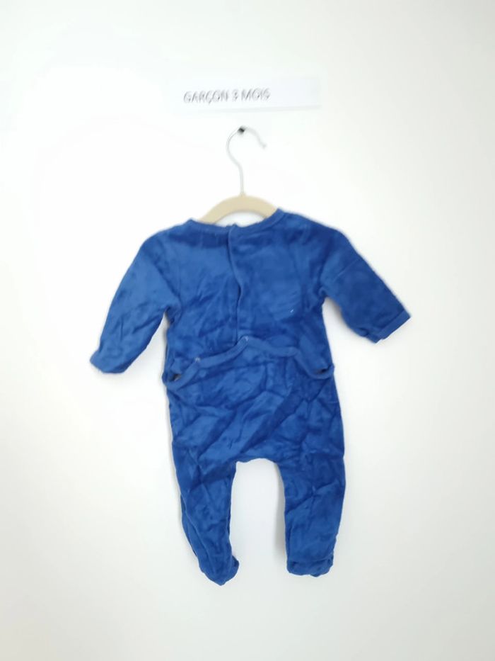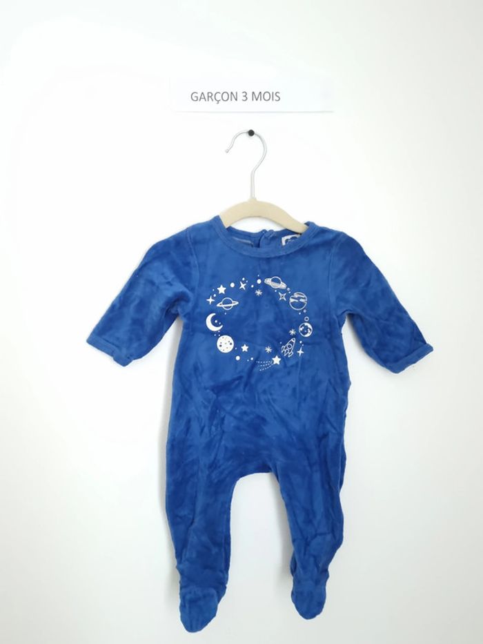 Pyjama 1 pièce chaud utilisé plusieurs fois en bon état, un des boutons pression à l'arrière est légèrement déchiré, voir photo (ce défaut est pris en compte dans le prix) marque Mots d'enfant 3 Mois fermeture par boutons pression sur l'arrière uni bleu avec motifs planètes en blanc mixte
