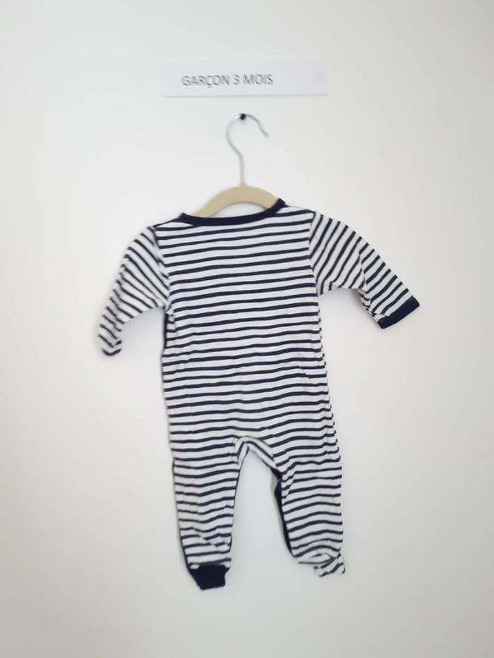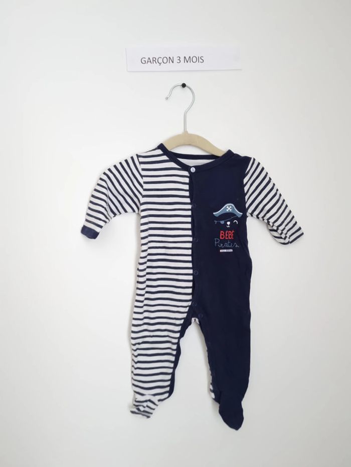 Pyjama 1 pièce chaud utilisé plusieurs fois mais en très bon état marque Pat & ripaton 3 mois fermeture par boutons pression sur l'avant blanc à rayures marines, la moitié verticale à l'avant est uni marine avec motifs pirate mixte mais plutôt garçon