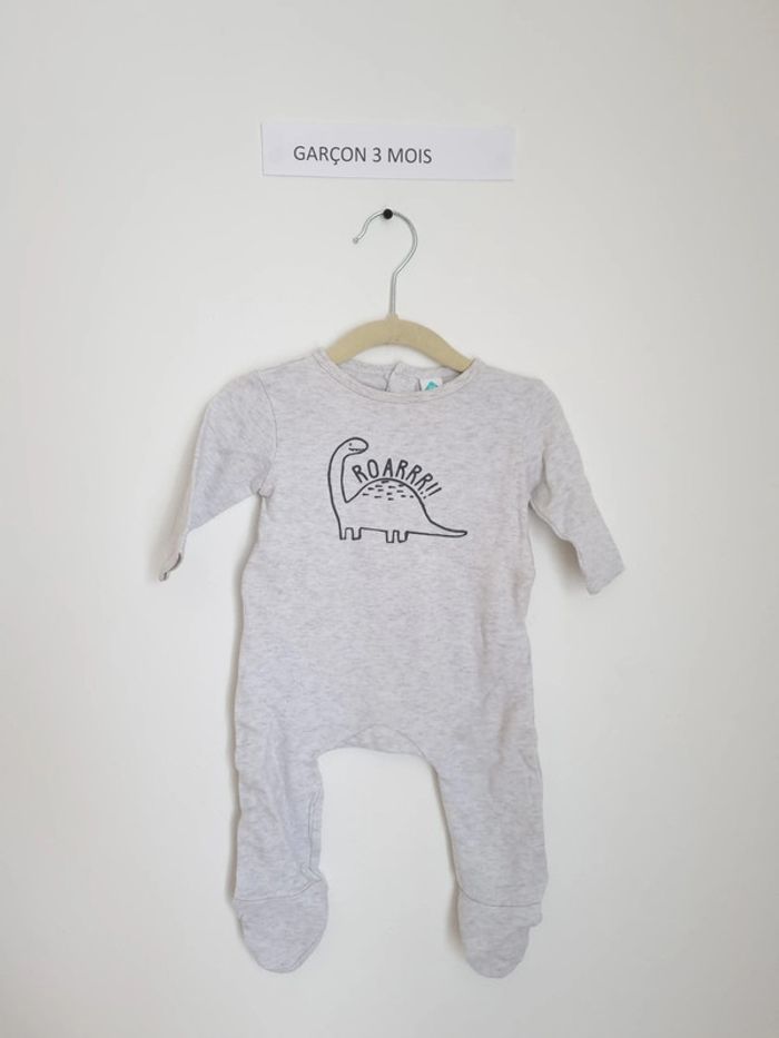 Pyjama 1 pièce léger utilisé plusieurs fois mais en très bon état marque tex baby 3 mois fermeture par boutons pression sur l'arrière gris avec motif dinosaure sur le devant plutôt garçon