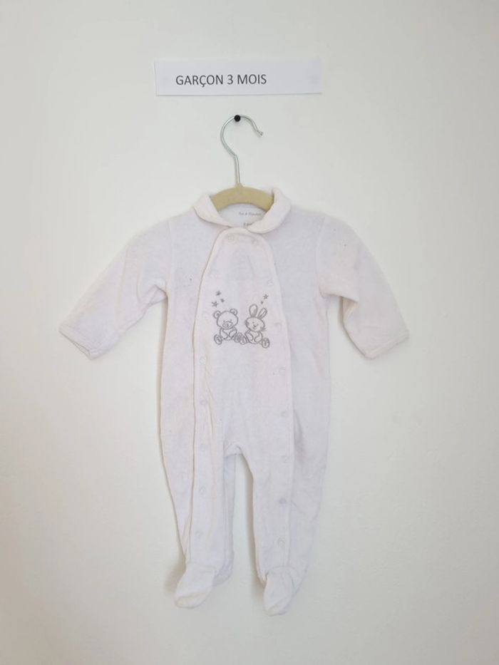 Pyjama 1 pièce chaud utilisé plusieurs fois mais en très bon état 3 Mois fermeture par 2 rangée de boutons pression sur l'avant allant jusqu'à chacun des pieds couleur blanc avec motif lapin et ourson mixte