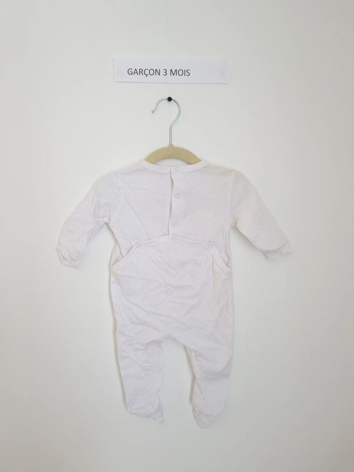 Pyjama 1 pièce leger marque grain de blé 3 mois 59cm fermeture par boutons pression sur l'arrière blanc avec inscription jaune " avec mamie tout est permis!" mixte utilisé plusieurs fois mais en bon état tous les vêtements sont relavés avant envoi, les tâches visibles seront retirés avec un détachant, cependant au cas où ça ne partirais pas correctement, je le prends en compte sur le prix