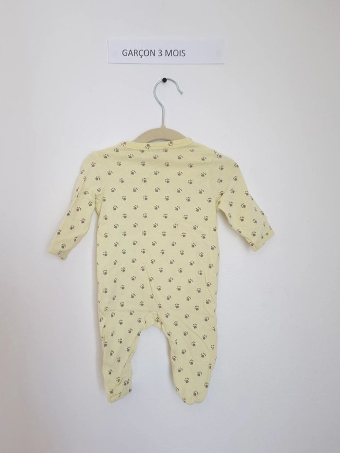 Pyjama 1 pièce léger utilisé plusieurs fois mais en très bon état marque Kiabi taille 3 Mois 56-62cm fermeture par boutons pression sur l'arrière couleur jaune clair à motif empreintes de chiens marron avec inscription "à pattes de velours" mixte