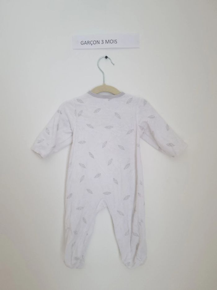 Pyjama 1 pièce chaud utilisé plusieurs fois mais en très bon état 3 mois fermeture par l'avant à l'aide de boutons pressions blanc à motifs feuilles grises mixte
