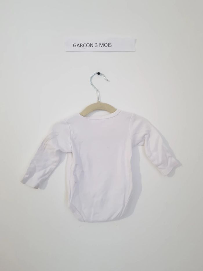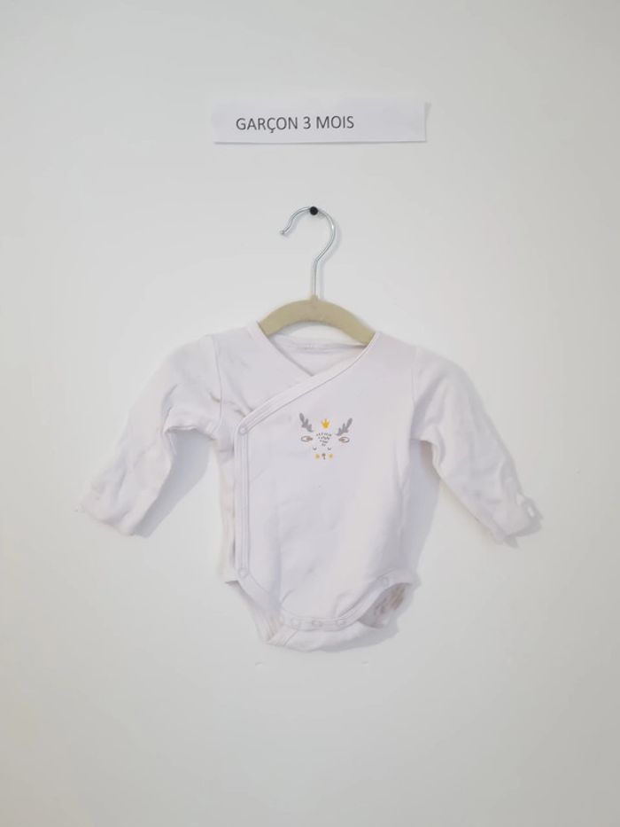 Body manche longues fermeture croisée à l'avant par boutons pression boutons pressions présent au niveau de l'entre-jambe body blanc avec motif cerf portés plusieurs fois mais en très bon état, je remarque des tâches au niveau de l'aisselle et au niveau du siège, je penses que ça au lavage avec un détachant, je relave chaque vêtements avant envoi mais je prends en compte sur le prix, au cas où ça ne partirai pas mixte 3 mois