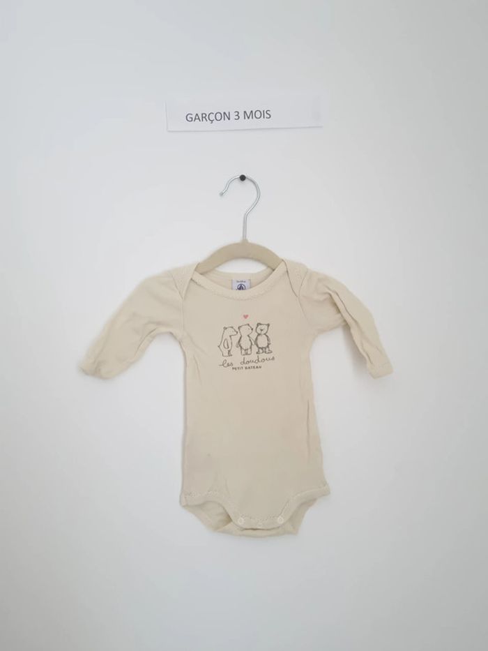 Body manche longues à enfiler par encolure américaine boutons pressions présent au niveau de l'entre-jambe body jaune clair avec dessin ourson "les doudous" portés plusieurs fois mais en très bon état mixte marque Petit bateau 3 mois 60 cm