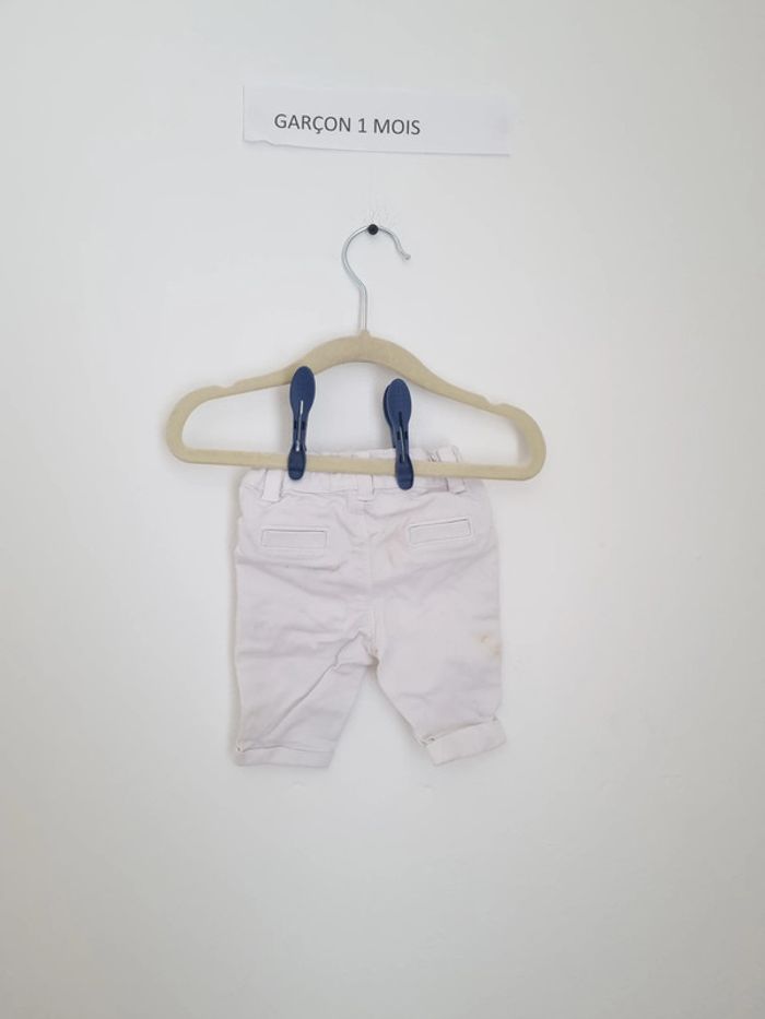 Pantalon garçon blanc uni en jean à enfiler, bouton présent, bouton marron élégant pour une cérémonie poches à l'arrière style chino porté une fois pour une occasion marque kiabi 1mois 52-55 cm 4 kilos