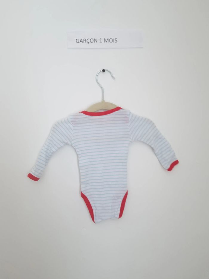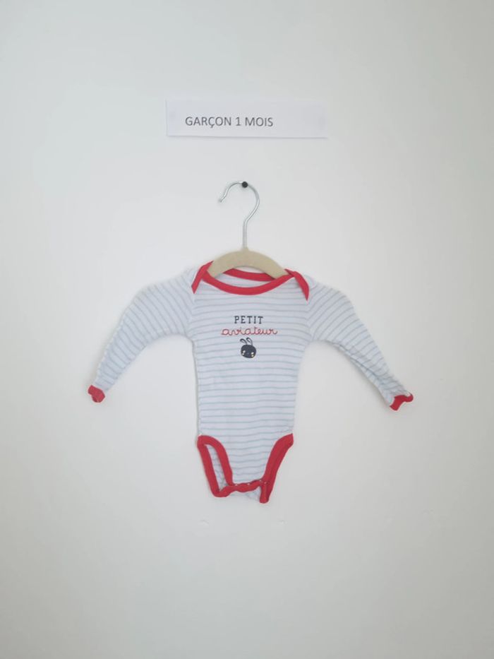 Body manche longue à enfiler par encolure américaine boutons pressions présent au niveau de l'entre-jambe blanc à rayure bleu clair, biais rouges avec inscription "petit aviateur" portés plusieurs fois mais en très bon état mixte marque orchestra 1 mois 54 cm
