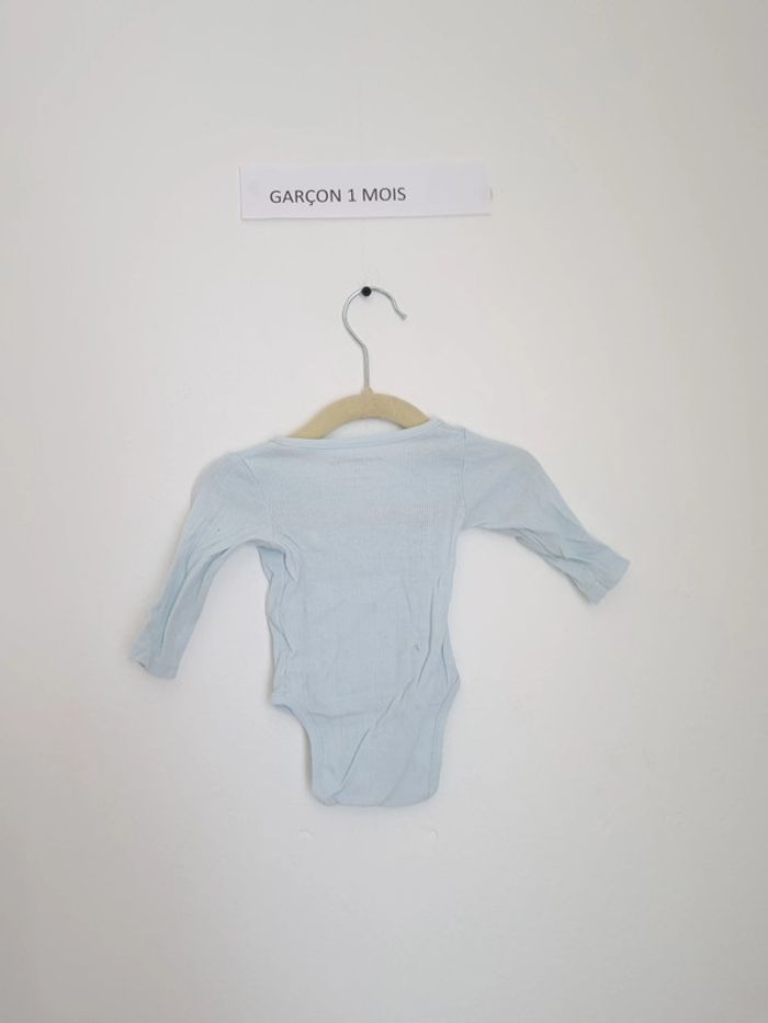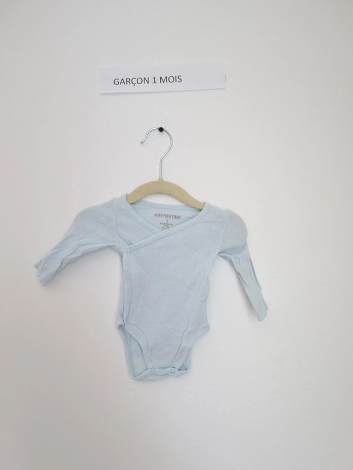 Body manche longue fermeture par l'avant par croisé, et boutons pressions boutons pressions présent au niveau de l'entre-jambe bleu clair uni légèrement côtelé portés plusieurs fois mais en très bon état mixte marque orchestra 1 mois 54 cm