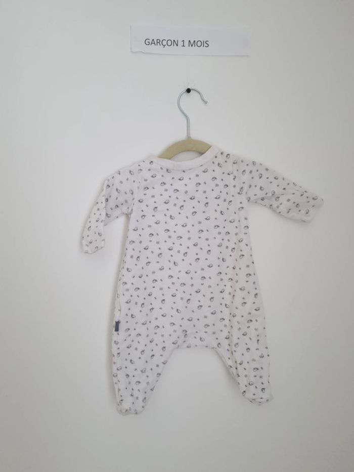 Pyjama 1 pièce chaud peu porté, un bouton de pression a cédé très rapidement tout en bas au niveau de l'entre-jambe(voir photo) défaut pris en compte dans le prix. marque du pareil au même taille 1Mois 53cm fermeture par boutons pression sur l'arrière blanc avec petits motif gris mixte