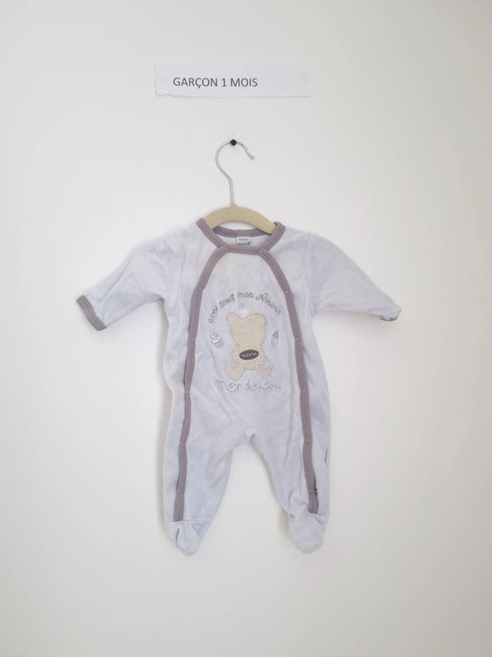 Pyjama 1 pièce chaud utilisé plusieurs fois mais en très bon état marque absorba taille 1Mois 54 cm fermeture par boutons pression sur l'avant sur 2 rangées allant vers chacun des pieds bleu clair avec biais gris-violet , petit ourson de dos avec inscription "avec tout mon amour mon doudou" mixte