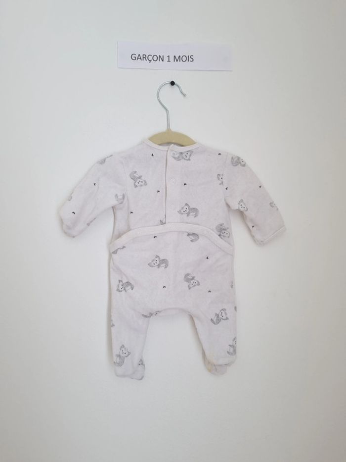 Pyjama 1 pièce chaud utilisé plusieurs fois mais en très bon état marque Kiabi taille 1Mois 52-55 cm 4 kilos fermeture par boutons pression sur l'arrière blanc avec petits paresseux gris mixte