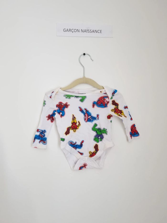 Body Naissance à encolure américaine, manche longue boutons pressions présent au niveau de l'entre-jambe gris à motif petits moutons portés plusieurs fois mais en très bon état mixte mais plutôt garçon marque Primark 0-3 mois