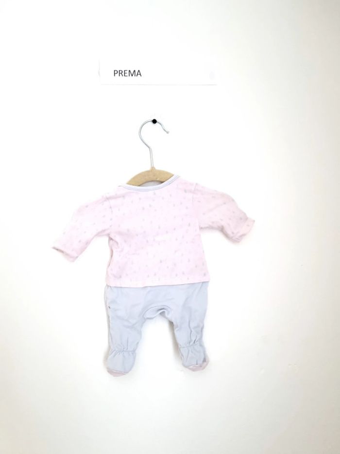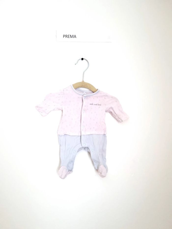 Pyjama 1 pièce léger utilisé plusieurs fois mais en très bon état marque Ochestra taille Prema / 45cm fermeture par boutons pression sur le devant effet "deux pièces, le haut est blanc avec motifs gouttes de pluie" et le bas bleu clair mais c'est bien 1 seule pièce
