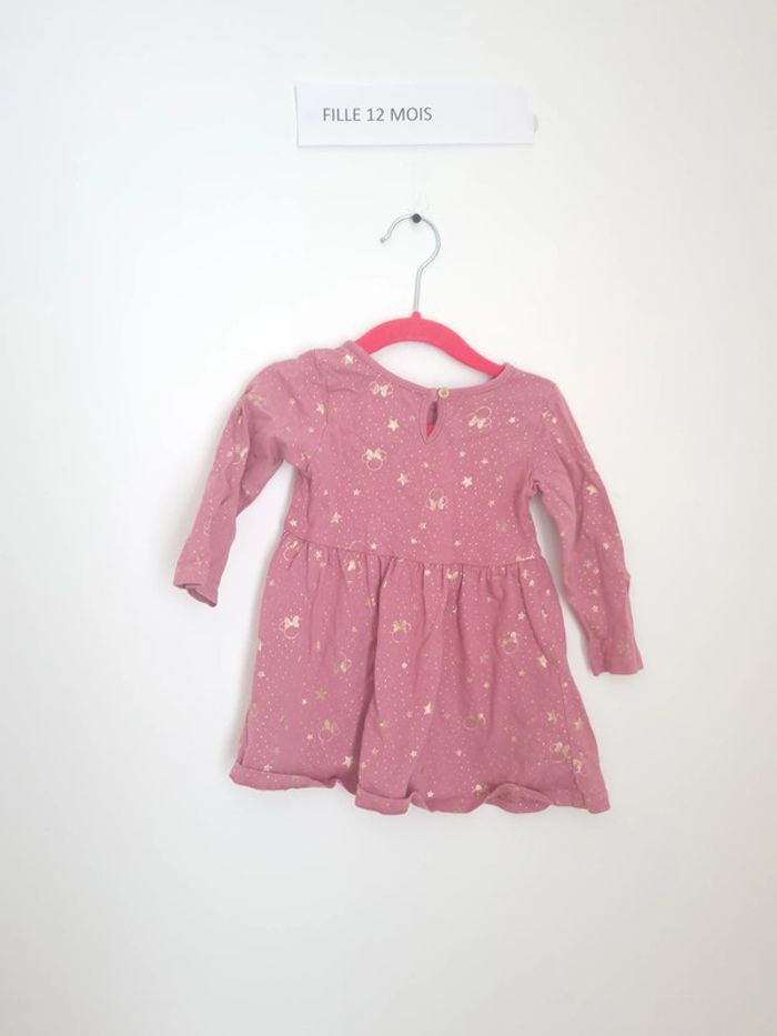 Robe manche longue vieux rose avec motifs Minnie Mouse et étoiles en doré fermeture à l'arriere par bouton Disney by primark 12/18 mois 86 cm très peu porté en très bon état