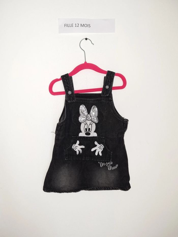 Robe salopette en jean noir avec Minnie Mouse porté une ou 2 fois en très bon état Primark 12/18 mois 62 cm
