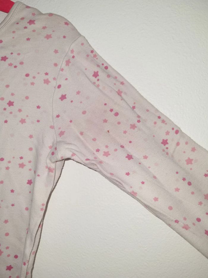 Pyjama 1 pièce blanc avec étoiles roses marque Primark en 12/18 mois 86 cm fermeture bouton pression sur l'avant porté plusieurs fois en très bon état mais attention il y'a des tâches du à un mauvais remplissage de machine à lavé qui à déteint sur le pyjama. n'entrave pas à sa fonction... je lave tous les vêtements avant envoi, je mettrais du détachant sur celui là mais je ne peux garantir que cela partira...