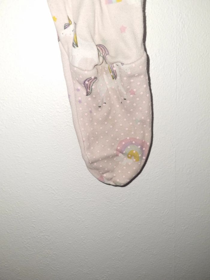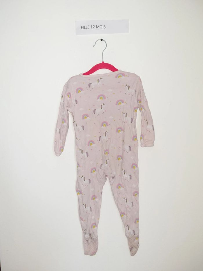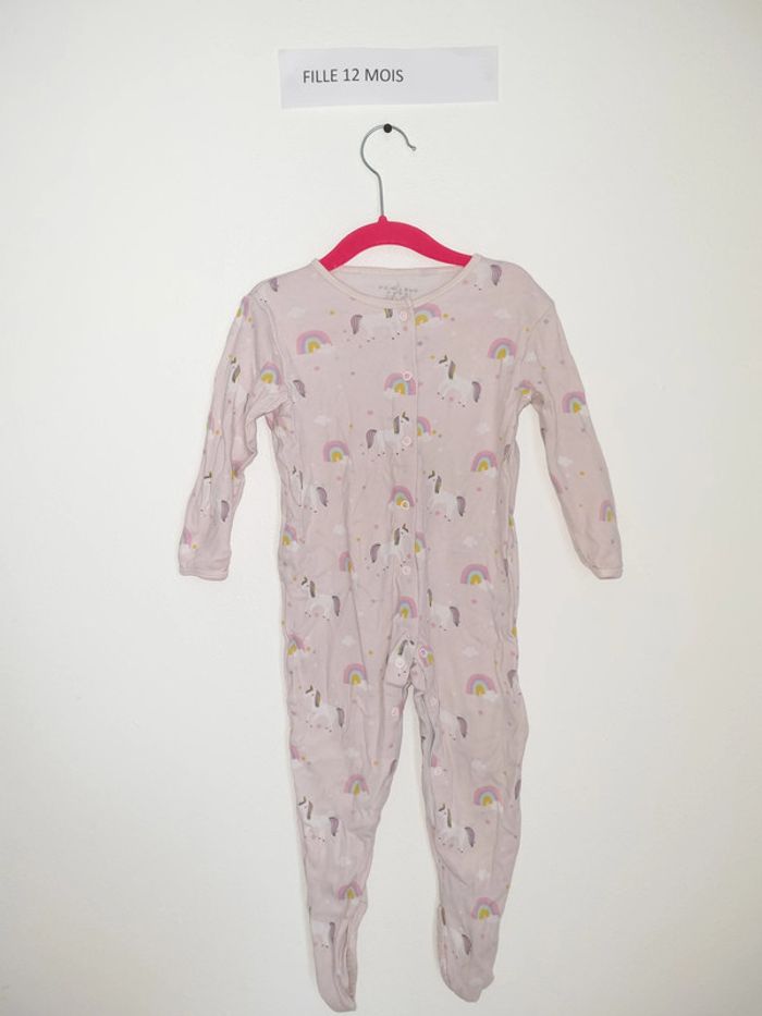 Pyjama 1 pièce rose clair avec motif licorne et arc en ciels marque Primark 12/18 mois 86 cm fermeture bouton pression sur l'avant pieds anti glisse porté plusieurs fois mais en bon état