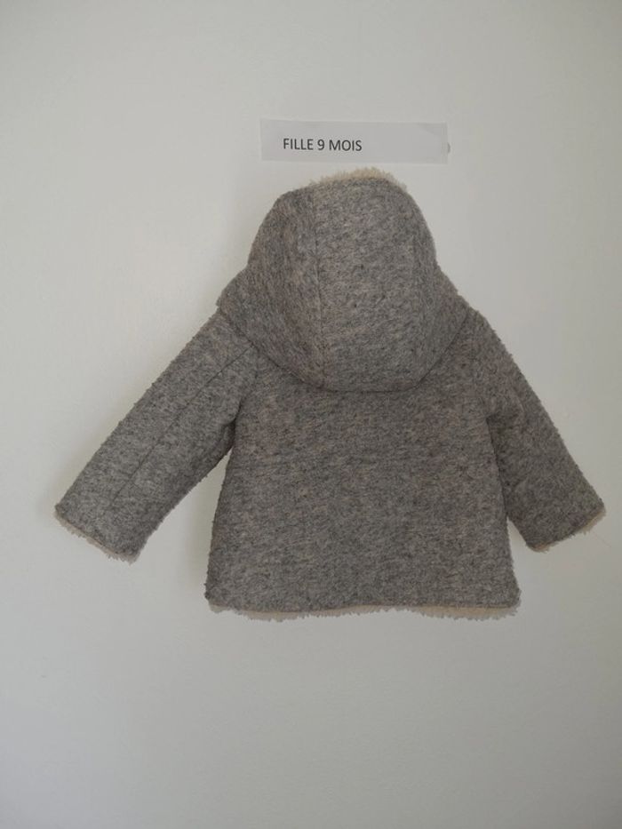 Manteau gris Zara Baby 9-12mois 80 cm fausse fourrure crème avec capuche et poches fermeture sur le devant par bouton porté plusieurs fois mais en très bon état