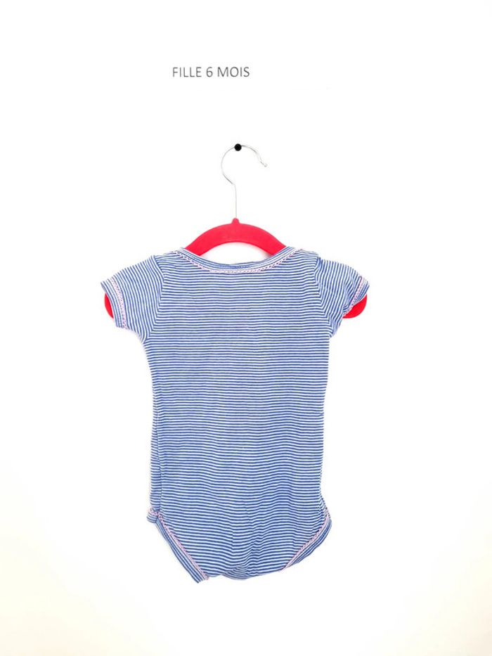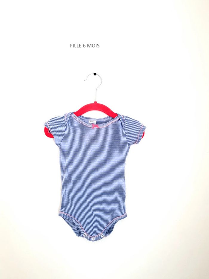 Body fille petit bateau manche courtes 6mois 67 cm à enfiler par encolure américaine bouton pression au niveau de l'entre-jambe rayé bleu et blanc avec petit nœud papillon rose au col portés plusieurs fois mais en très bon état