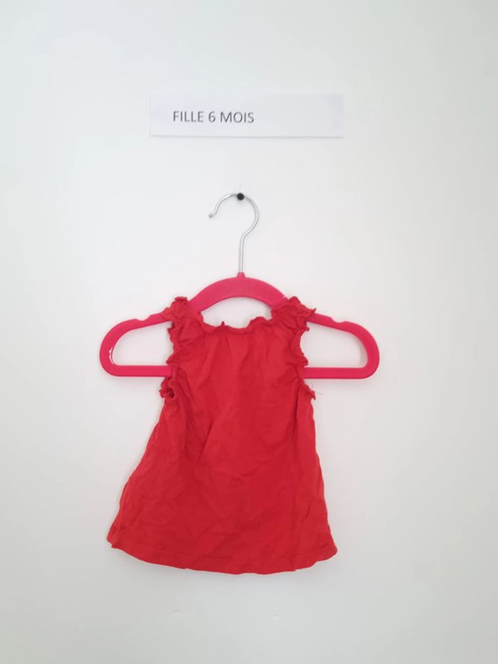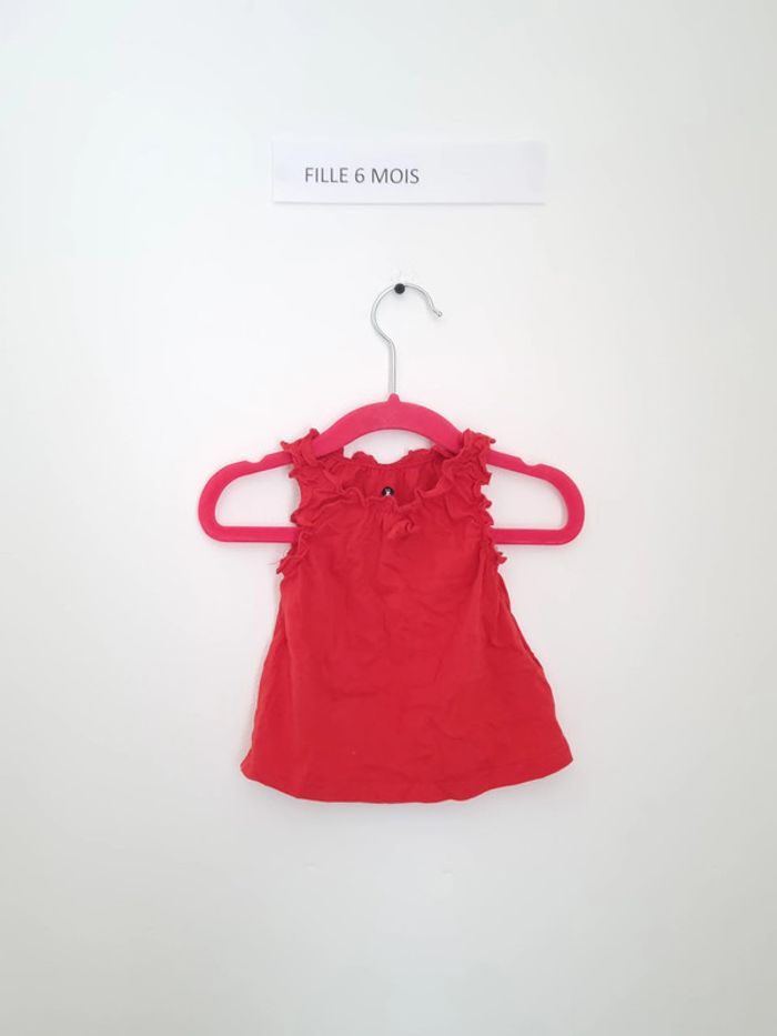 T-shirt rouge à enfiler sans manches col et manche élastiques très peu porté, très bon état grain de blé 6 mois