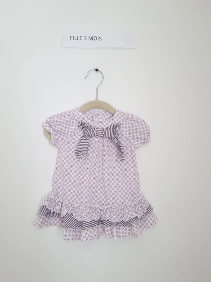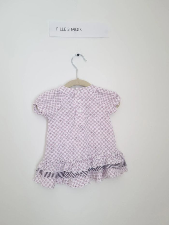 Tunique fille blanche taille 3 mois bouton sur l'arrière jusqu'à mi dos motif à fleur violettes portés une ou deux fois en très bon état