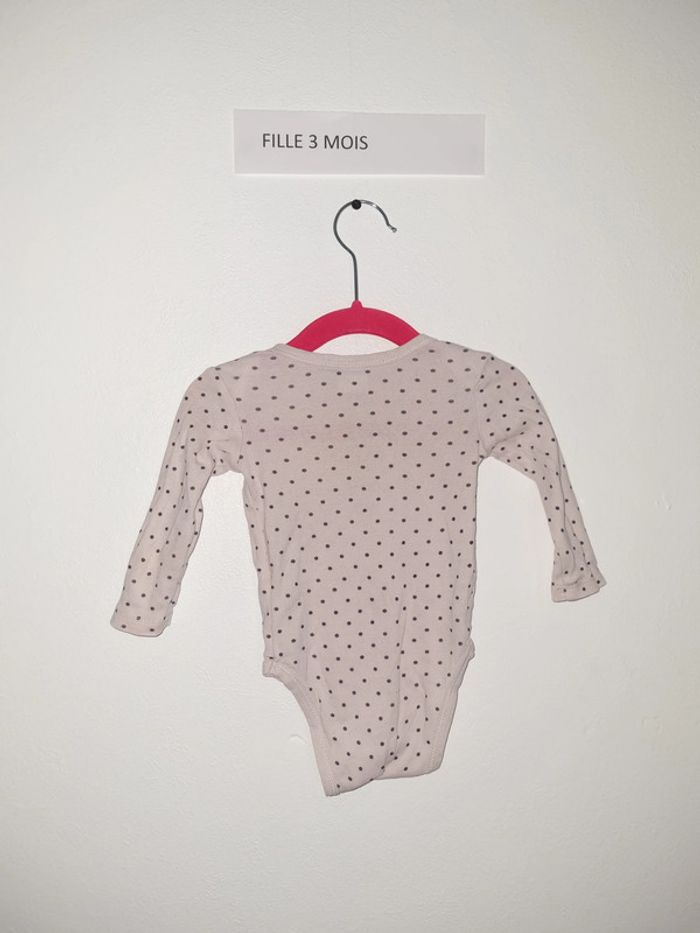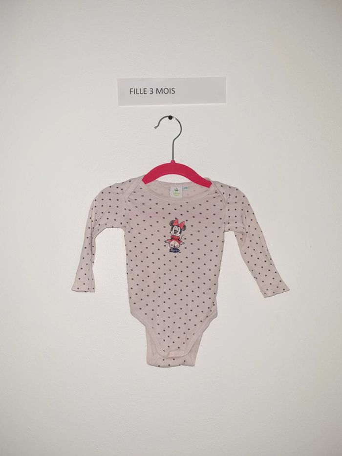 Body fille 3 mois rose pâle à pois gris avec Minnie dessus Encolure américaine avec bouton pression au niveau de l'entre jambe marque Disney baby 3-6 mois