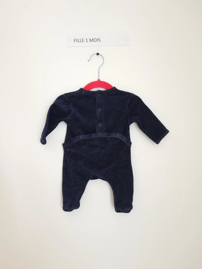 Pyjama velours fille mais peut être mixte "ma petite famille d'amour" de couleur bleu marine avec un petit cœur moutarde fermeture sur l'arrière par boutons pressoir