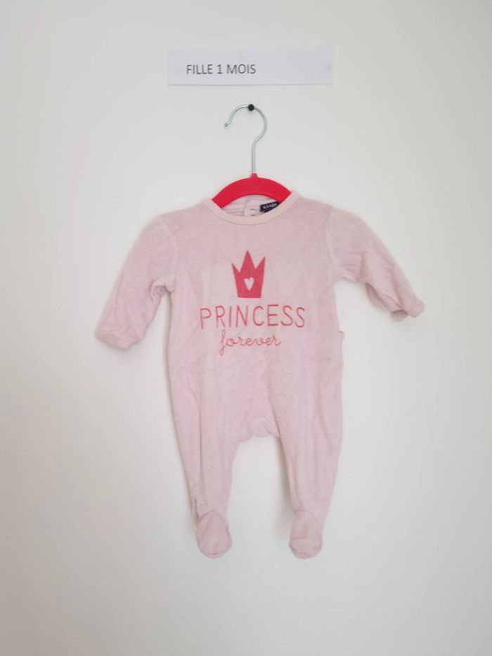 Pyjama rose clair avec un inscription " princesse forever" ( princesse pour toujours) fermeture sur l'arriere par boutons pressoir kiabi 1 mois 52-55 cm 4 kilos