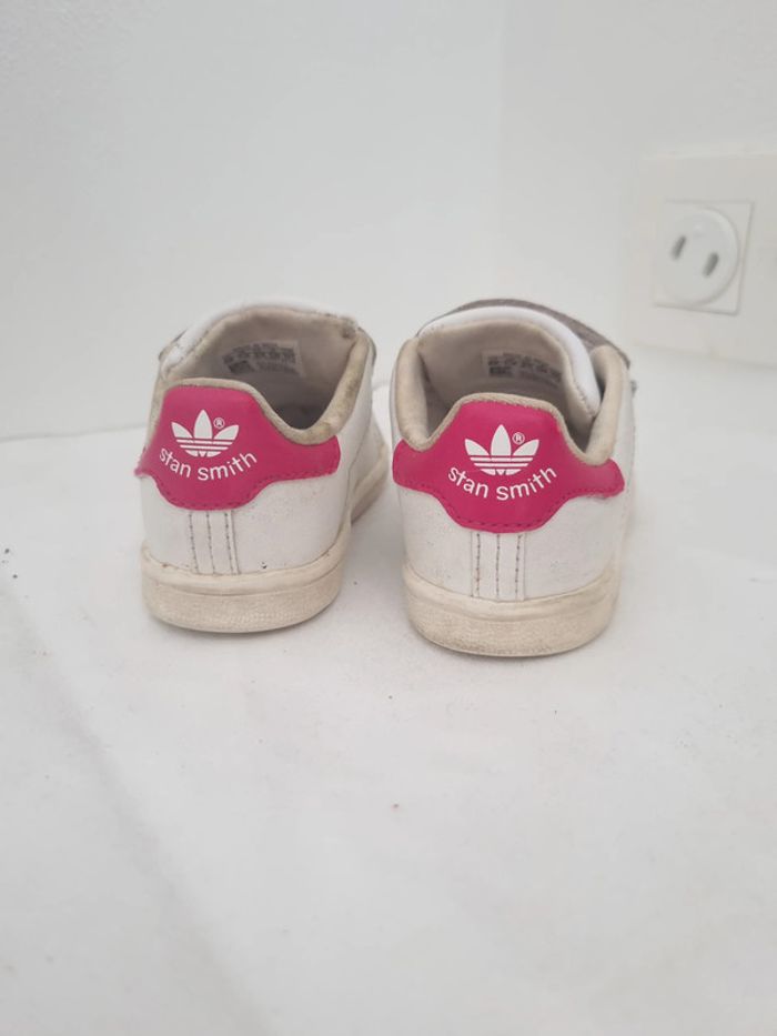 Chaussures Adidas blanche et rose, stan smith présente des traces d'usure sur le devant, qui ne se voient presque pas une fois la chaussure bien nettoyée ( ce qui n'est pas le cas au moment d'avoir pris la photo) RAS sur le reste fermeture à scratch