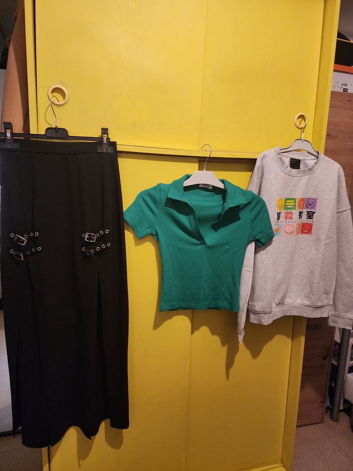 Lot de vêtements femmes taille 36 ou taille S Ils sont en très bon état car très peu porté Il y a 2 ceintures 1 jupe short blanche à pois noir 2 pantalons cargo noir et kaki 1haut de jogging portugais 2 petits hauts Un pantalon en toile à pinces noir Une robe grise style débardeur 1 robe en lurex qui brille et lien coulissant sur le côté Un sweat gris Un pantalon léger pour été marron ouvert sur les côtés et il y a un rabat qui s'attache par devant Un petit polo court vert 1 grande jupe noir ayant 2 fentes devant avec 2 attachés en fer