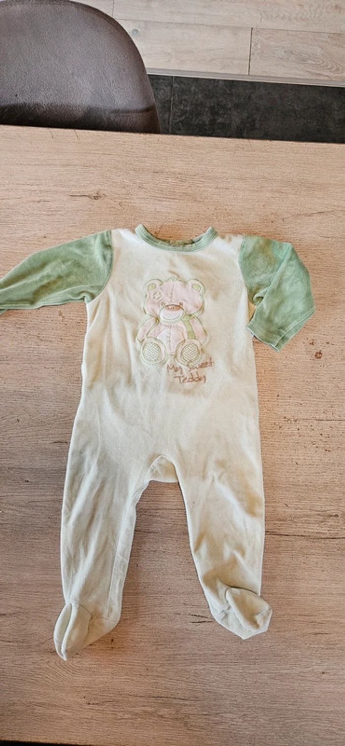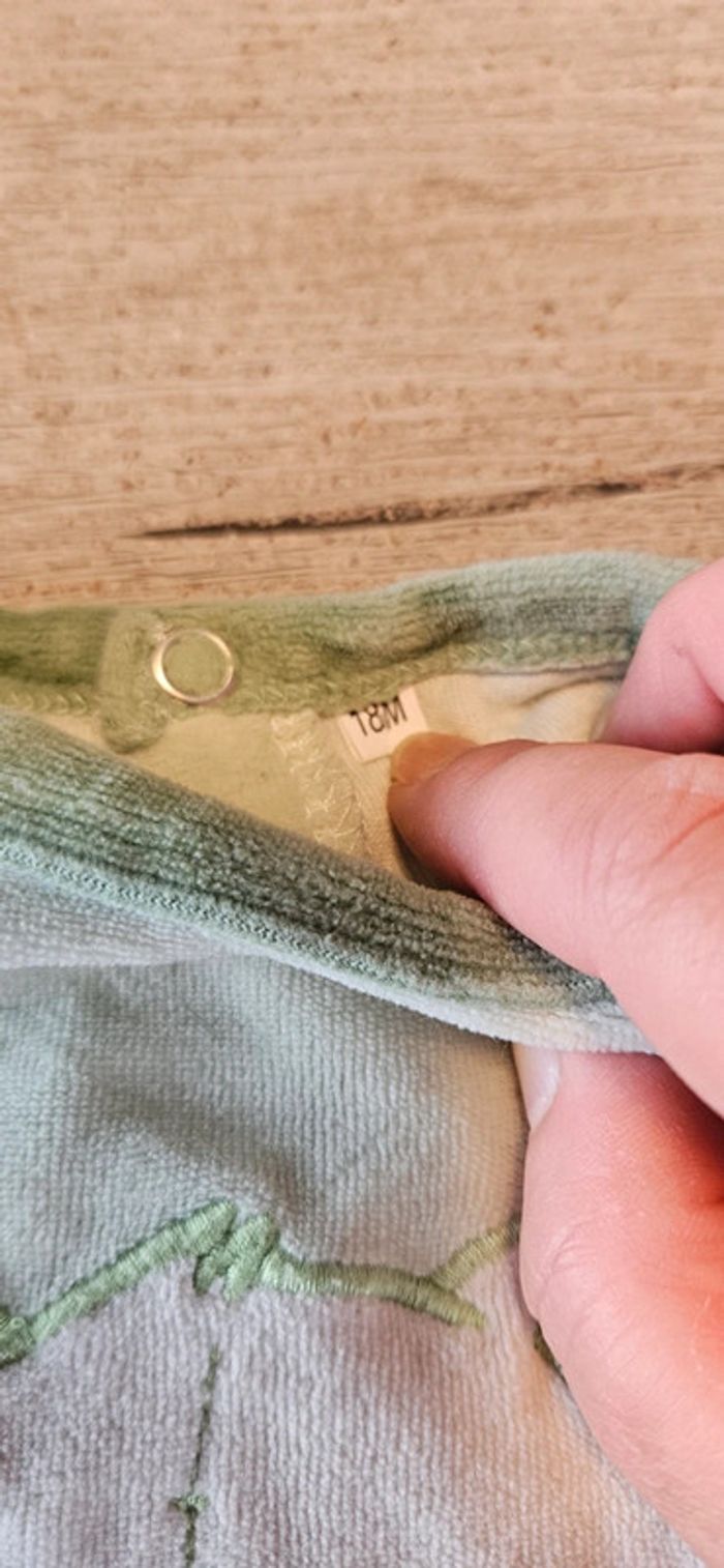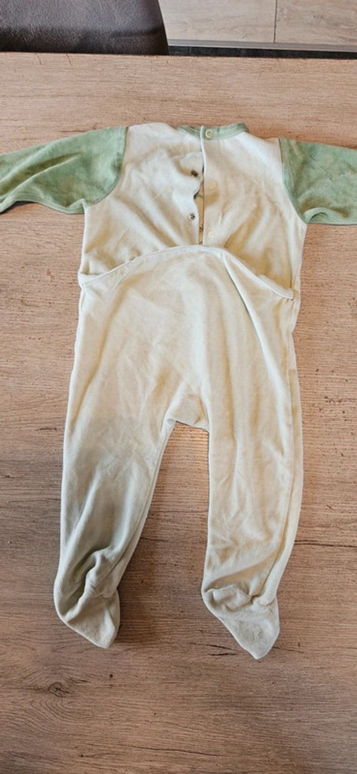 Pyjama en velour vert très clair avec bord plus foncé. Mis mais peu. Se ferme par des pressions a l arrière. Convient bien pour du 18 mois #deborahtock_18mois