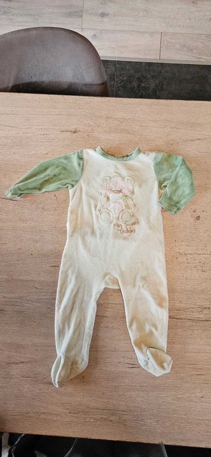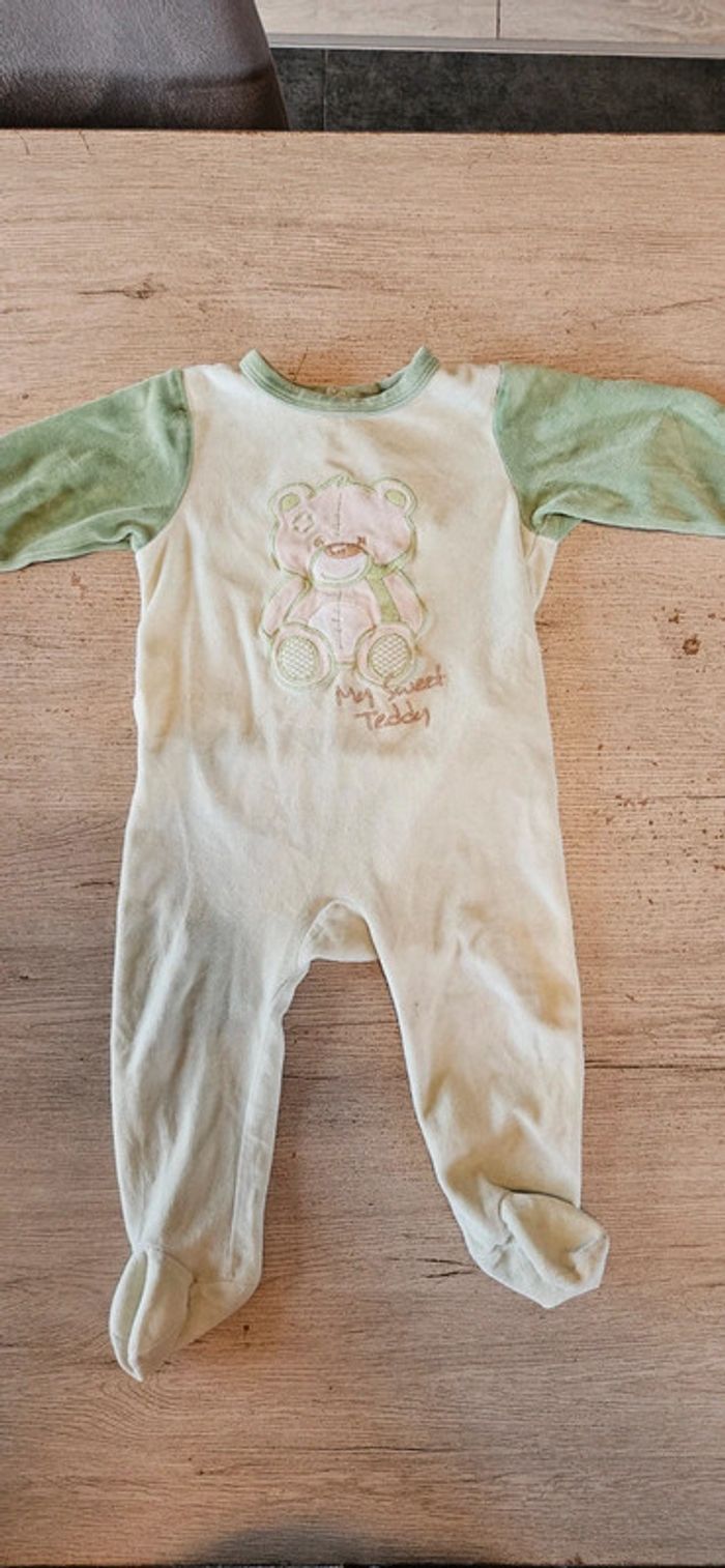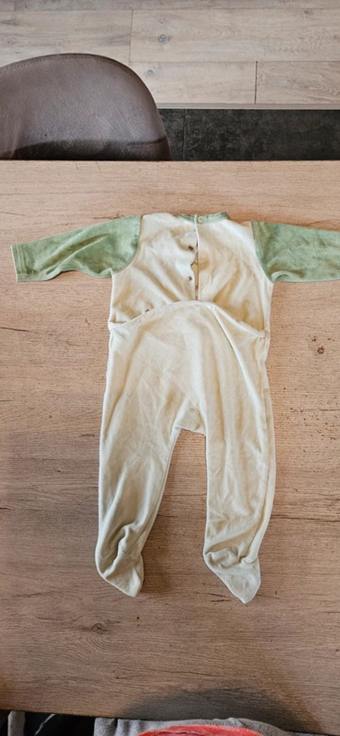 Pyjama en velour vert très clair avec bord plus foncé. Mis mais peu. Se ferme par des pressions a l arrière. Convient bien pour du 18 mois #deborahtock_18mois