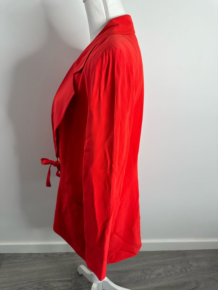 Blazer - Excellent état - Taille 44 équivalent XXL - Rouge orange et doré - Couleur flamboyante identique aux photos - Alternance Guy Laroche - Vintage, années 80’ - Doublure intérieure - Se ferme avec un lien - Fabrication française 🇫🇷 - Acétate, viscose et polyester Dimensions: - 45cm niveau épaule - 54cm niveau aisselle - 76cm de long