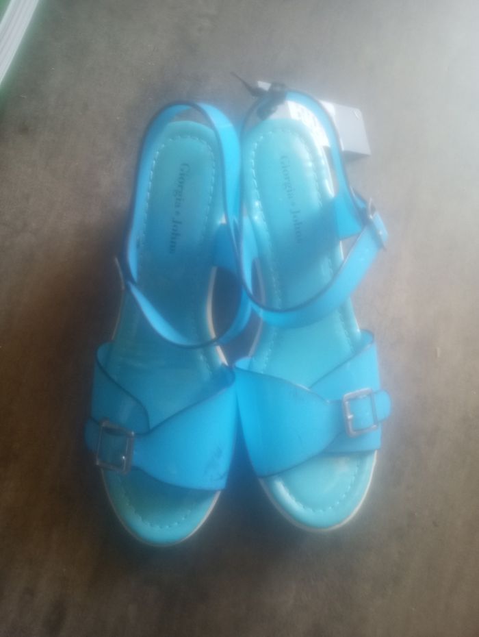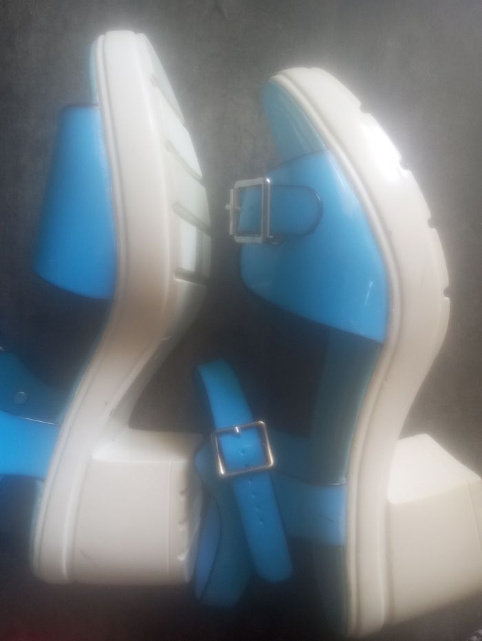 Chaussure compensée pas très haut réglable sur le dessus couleur bleu en plastique très agréable au pied Quelques traces sur le dessus de la chaussure et sur un côté de la chaussure sinon neuf avec étiquette taille 41